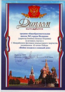 1 апреля 2010г. группа учащихся по приглашению МОУ Бельская СОШ получила возможность стать участниками 1 межрайонного фестиваля компьютерного творчества "Война входила в каждый дом". на конкурс были представлены работы в нескольких номинациях: "Графика", "Информационная презентация", "Исследовательская презентация", "Сайтостроение". С защитой своих работ выступили: Быстрова Екатерина (9а кл.), Осипов Сергей (10 кл.), Брагин Михаил (10 кл.). По итогам фестиваля этим ребятам были вручены грамоты призеров, а также всем участникам - сертификаты. Выступления Брагина Михаила, Осипова Сергея, Быстровой Екатерины были отмечены дипломами Бельского краеведческого музея. А Скачкова Дарья (ученица 7а кл.) награждена грамотой Совета ветеранов г. Белый.