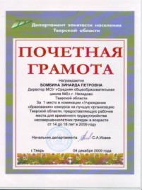 24 июня 2010 г. директору школы - Зинаиде Петровне Бомбиной - вручена благодарность губернатора Тверской области Д.В.Зеленина за достигнутые успехи в работе по организации и совершенствованию учебного и воспитательного процессов в образовательных учреждениях Тверской области.