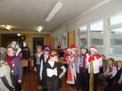 24 декабря ребята пригласили к себе в гости первоклашек. Малыши узнали, откуда к нам пришли Снеговик и Снегурка, а Дедушки Морозы из 2а порадовали всех маленькими подарками. В этот же день команды Дедов Морозов из 2а, Снегурок из 2б и Снеговиков из 2в померились силами в веселой новогодней эстафете «Под Новый год».