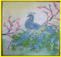 Также мы предлагаем работу, которая чем-то похожа на красивый декоративный ковёр. Выполнена она в технике торцевание, которая также относится с искусству бумагокручения. Сюжет для таких диковинных ковров может быть самым разнообразным. Мы выбрали пернатых певцов и надеемся, что эта работа посетителям выставки покажется интересной.