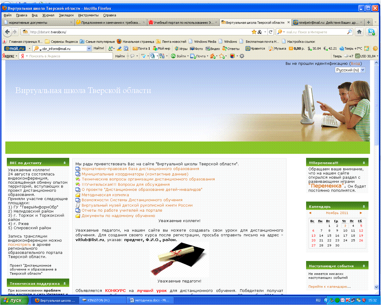01.-12.112011г. в рамках реализации проекта "Дистанционное обучение детей-инвалидов Тверской области" в муниципальном Центре дистанционного обучения детей-инвалидов МОУ средней школы № 5 г. Нелидово проходит обучение педагогов Нелидовского, Оленинского, Западнодвинского, Жарковского районов по теме "Создание уроков на портале "Виртуальная школа Тверской области".