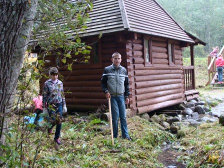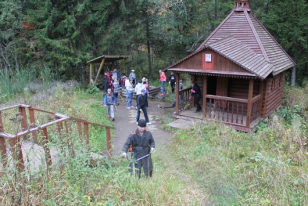 Водитель автобуса Курбан Натифович скосил пожелтевшую траву вокруг часовни и источника, дети сгребли ее, собрали мусор в мешки, подмели дорожки и крыльцо часовни. Довольные результатом своего труда, набрали и испили чистейшей студеной святой воды.