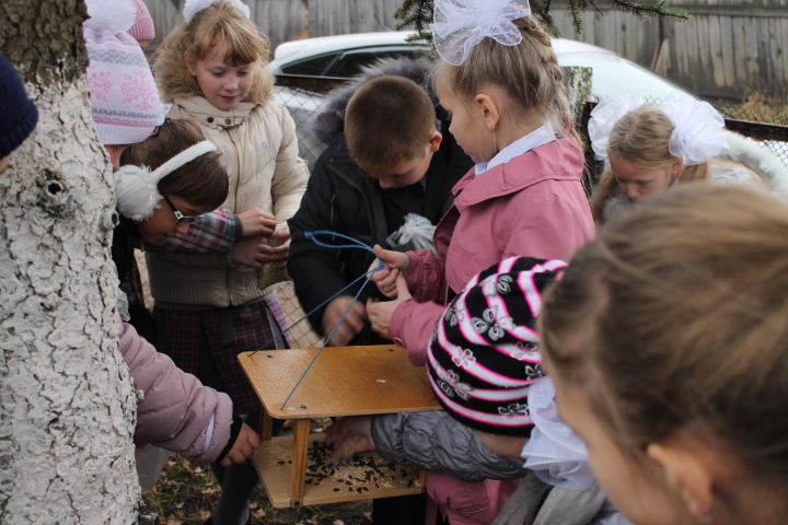 В этот день на пришкольной территории было открыто «Синичкино кафе». Дежурным назначен 4 б класс. Ребята решили: не дать погибнуть зимой от голода нашим зимующим птицам и принять участие в акции «Покормите птиц зимой».
