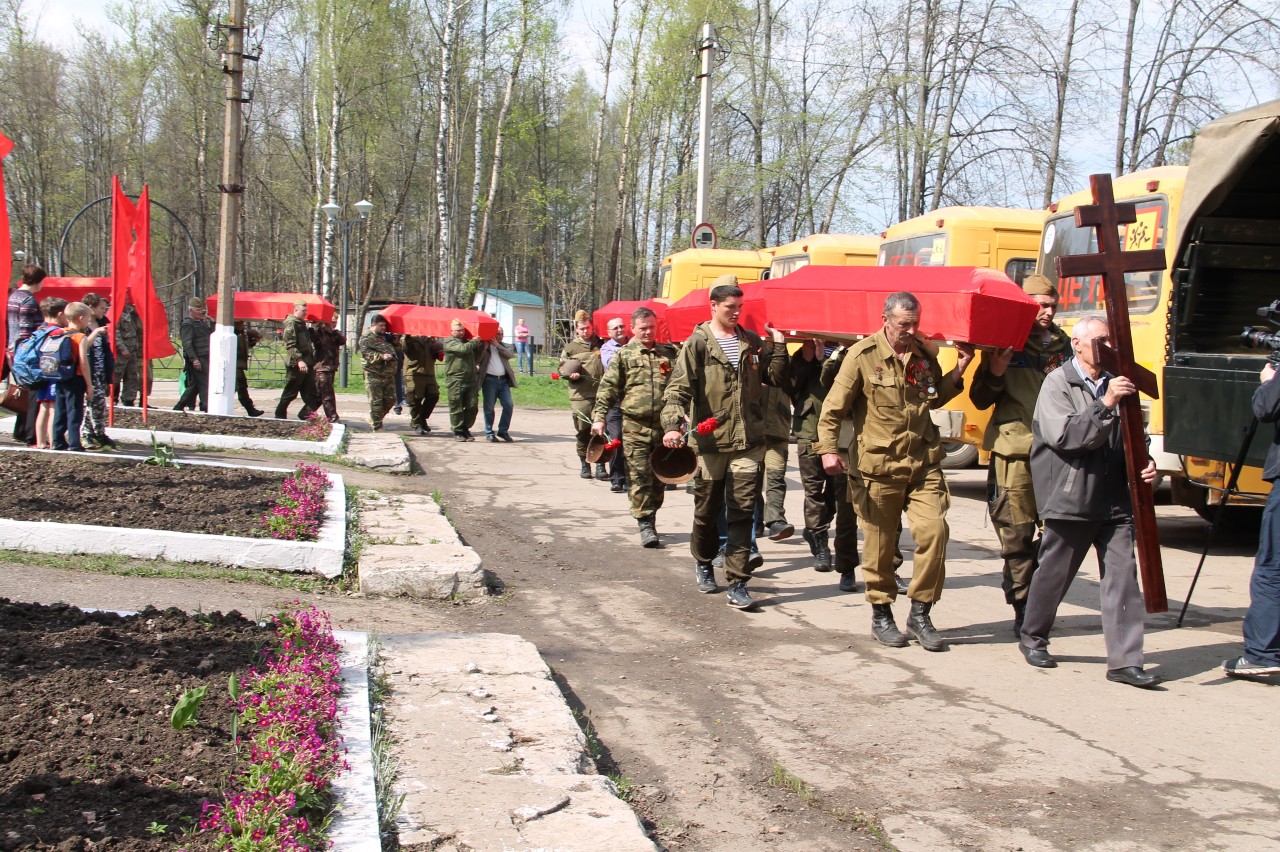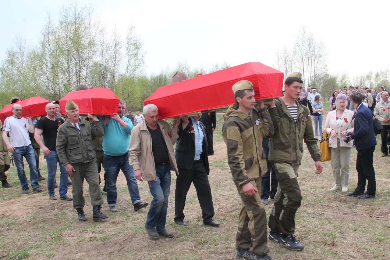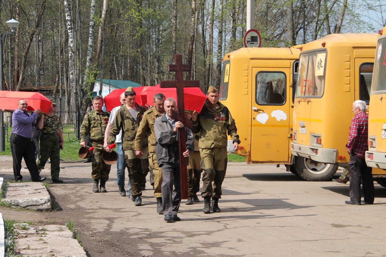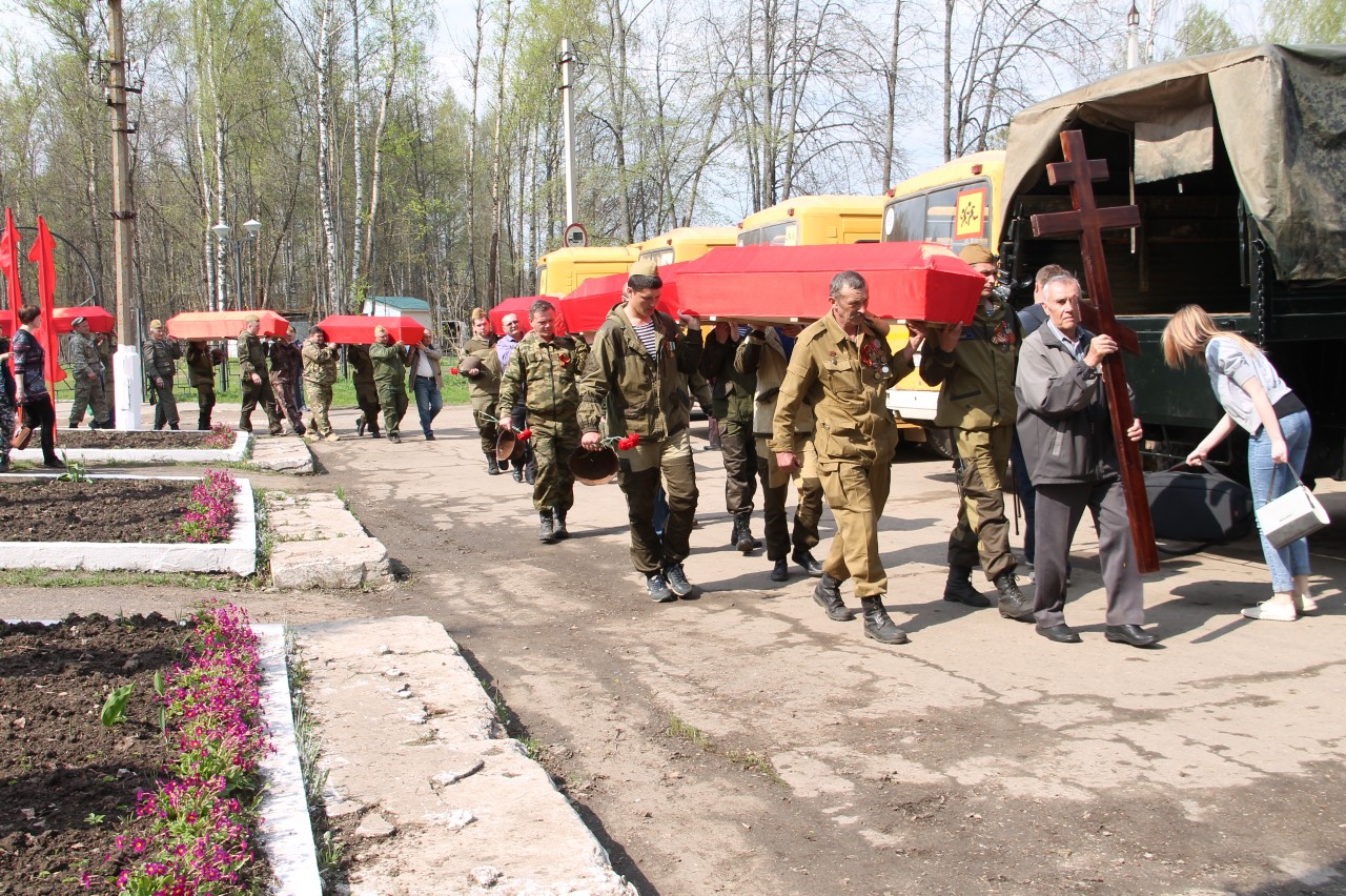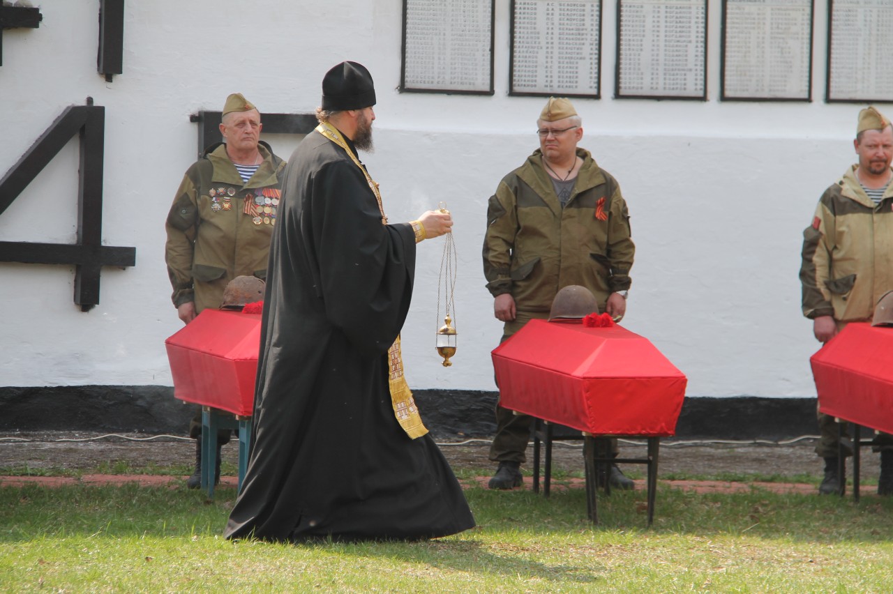 По окончании работы интерактивных площадок участники Конференции собрались в актовом зале Школы №5 для подведения итогов теоретической части Конференции. А впереди всех ждало незабываемое мероприятие 2-й части Конференции – участие в перезахоронении останков семи воинов, погибших в годы Великой Отечественной войны, найденных во время работ поисковыми отрядами г. Нелидово «Гвардия» и «Вечность». Торжественной колонной участники Конференции прошли к мемориалу Славы на площади Жукова, где состоялся митинг-реквием в память о погибших, во время которого была отслужена лития. Все собравшиеся у мемориала Славы почтили память погибших в годы войны минутой молчания. Затем гробы с останками солдат были погружены в машины «Урал» для того, чтобы доставить их в д. Карпово, где должно было пройти перезахоронение. Туда же отправились и участники Конференции. По прибытии после панихиды в память о погибших воинах гробы с останками солдат предали вечному покою на Нелидовской земле, а на их могилу были возложены алые гвоздики. Очень жаль, что имена этих воинов остались неизвестными, но память об их подвиге, мужестве навсегда останется в сердцах нелидовцев.
